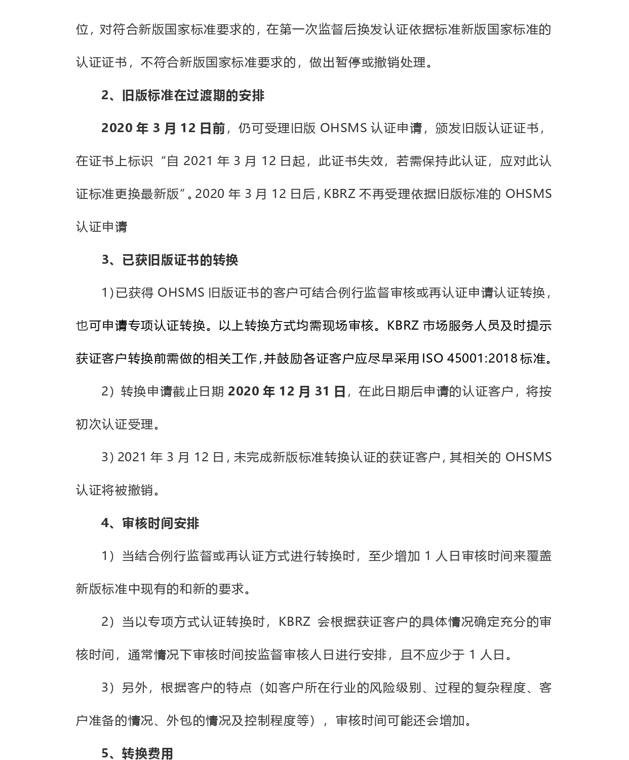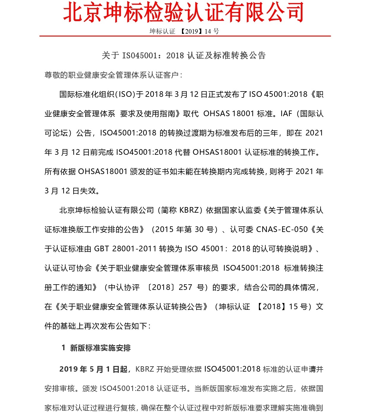 關于職業(yè)健康安全管理體系認證轉換公告